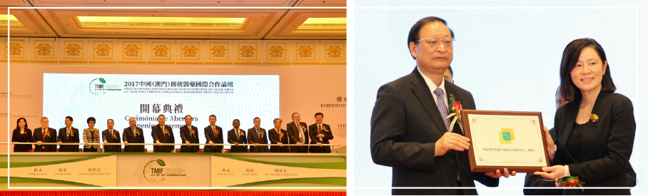 2017年9月,第三屆中國(guó)(澳門)傳統(tǒng)醫(yī)藥國(guó)際合作論壇隆重開幕,本屆論壇以“傳承、創(chuàng)新、國(guó)際化”為主題,吸引了澳門、香港、內(nèi)地、歐盟、東盟及葡語(yǔ)系國(guó)家相關(guān)專業(yè)人士600多人出席。澳門特別行政區(qū)政府行政長(zhǎng)官崔世安等主禮嘉賓共同啟動(dòng)論壇開幕式暨產(chǎn)業(yè)園公共服務(wù)平臺(tái)落成儀式,時(shí)任國(guó)家中醫(yī)藥管理局局長(zhǎng)王國(guó)強(qiáng)授予產(chǎn)業(yè)園“中醫(yī)藥產(chǎn)品海外注冊(cè)公共服務(wù)平臺(tái)(橫琴)”,澳門特別行政區(qū)政府經(jīng)濟(jì)財(cái)政司司長(zhǎng)梁維特為產(chǎn)業(yè)園專家顧問委員會(huì)首席顧問頒授聘書。與會(huì)嘉賓緊密圍繞“傳統(tǒng)醫(yī)藥、健康產(chǎn)業(yè)、國(guó)際合作”相關(guān)的政策、技術(shù)、市場(chǎng)發(fā)展策略等方向進(jìn)行交流探討。是次論壇結(jié)合國(guó)家“一帶一路”倡議,以及澳門“一個(gè)中心,一個(gè)平臺(tái)"的定位,充分發(fā)揮產(chǎn)業(yè)園作為“中醫(yī)藥產(chǎn)業(yè)與文化一帶一路國(guó)際窗口”的平臺(tái)作用,促進(jìn)國(guó)家傳統(tǒng)醫(yī)藥產(chǎn)業(yè)的國(guó)際合作。