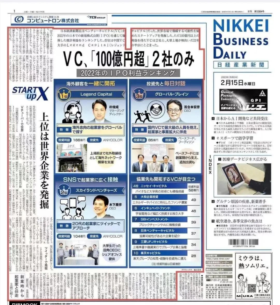 Legend Capital’s investment case of Anycolor was ranked first on the "Nikkei" annual highest return venture capital list