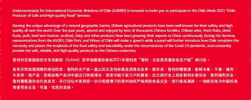 ZVCA受智利駐華大使館邀請參加“智利周-食品研討會”,歡迎協(xié)會食品相關行業(yè)投資機構、企業(yè)參會交流。