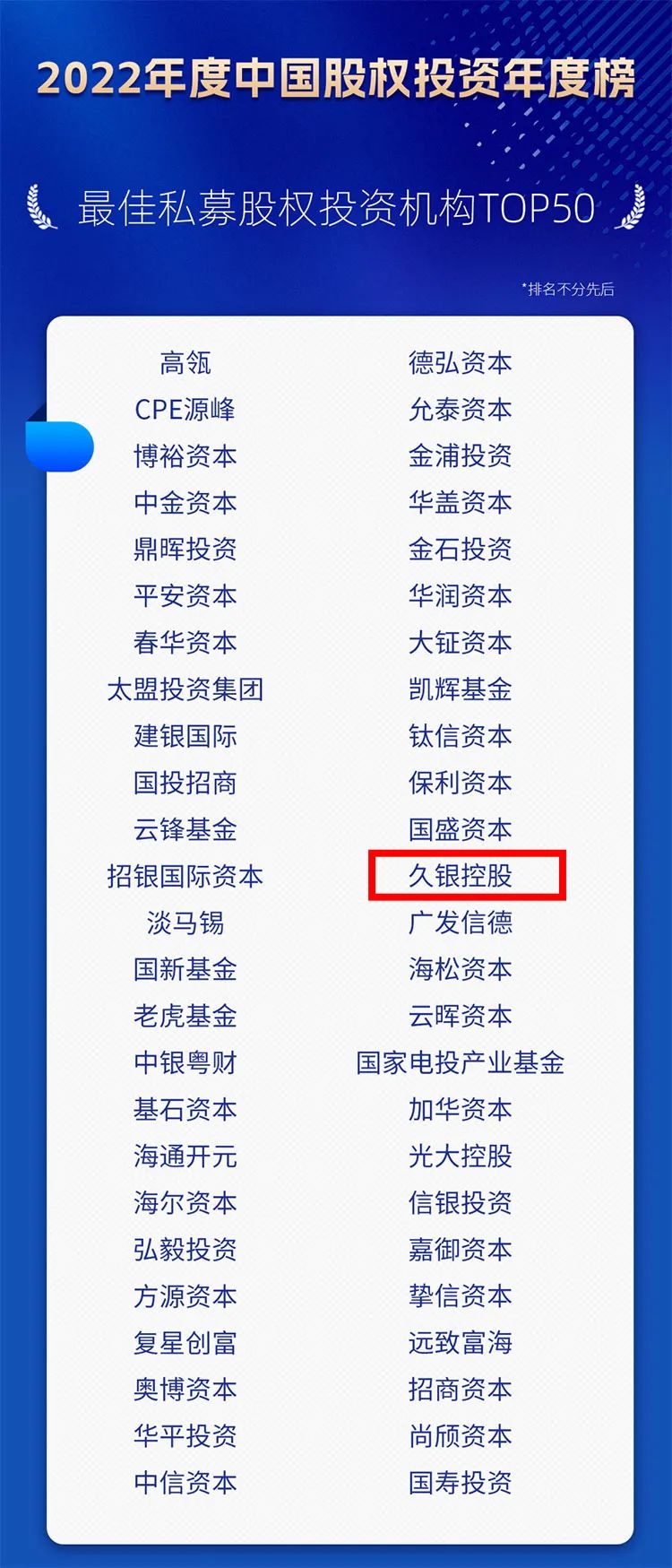 久銀控股榮獲投資家“2022年度最佳私募股權(quán)投資機(jī)構(gòu)TOP50”獎項
