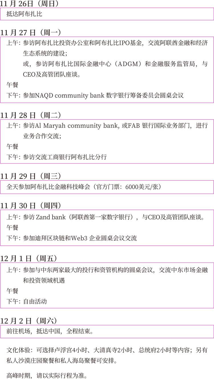 阿布扎比和迪拜五星酒店(單間)、所列餐費(fèi)、商務(wù)活動(dòng)(含阿布扎比金融科技峰會(huì)門(mén)票)、集體用車(chē)、司機(jī)、隨行、商務(wù)參訪翻譯、文化體驗(yàn)費(fèi)用。