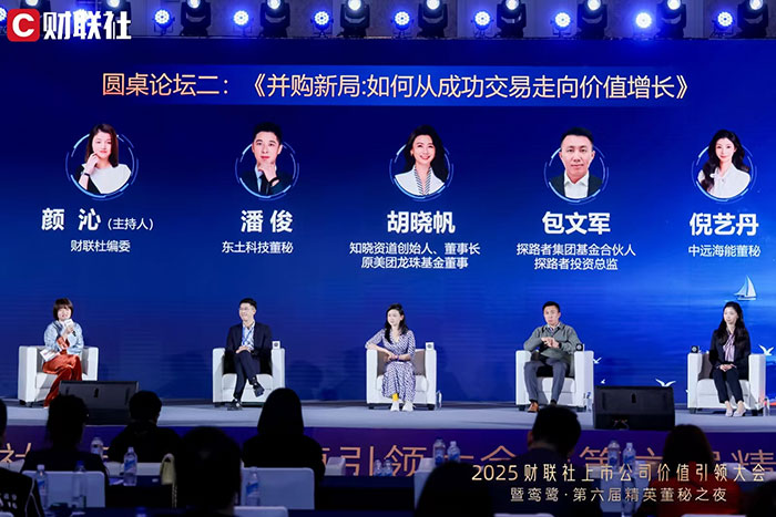財聯(lián)社編委顏沁與東土科技董秘潘俊,知曉資道創(chuàng)始人、董事長、原美團(tuán)龍珠基金董事胡曉帆,探路者集團(tuán)基金合伙人、探路者投資總監(jiān)包文軍及中遠(yuǎn)海能董秘倪藝丹,圍繞“并購新局:如何從成功交易走向價值增長”的角度為企業(yè)發(fā)展建言獻(xiàn)策。
